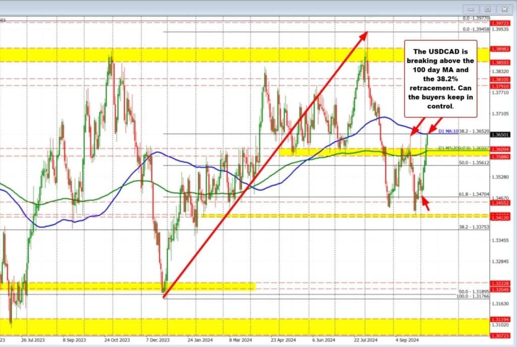 يتجاوز زوج الدولار الأمريكي مقابل الدولار الكندي (USDCAD) القمة السابقة من سبتمبر، ومتوسط الحركة لـ 100 يوم، ومستوى تصحيح 38.2% المكسور